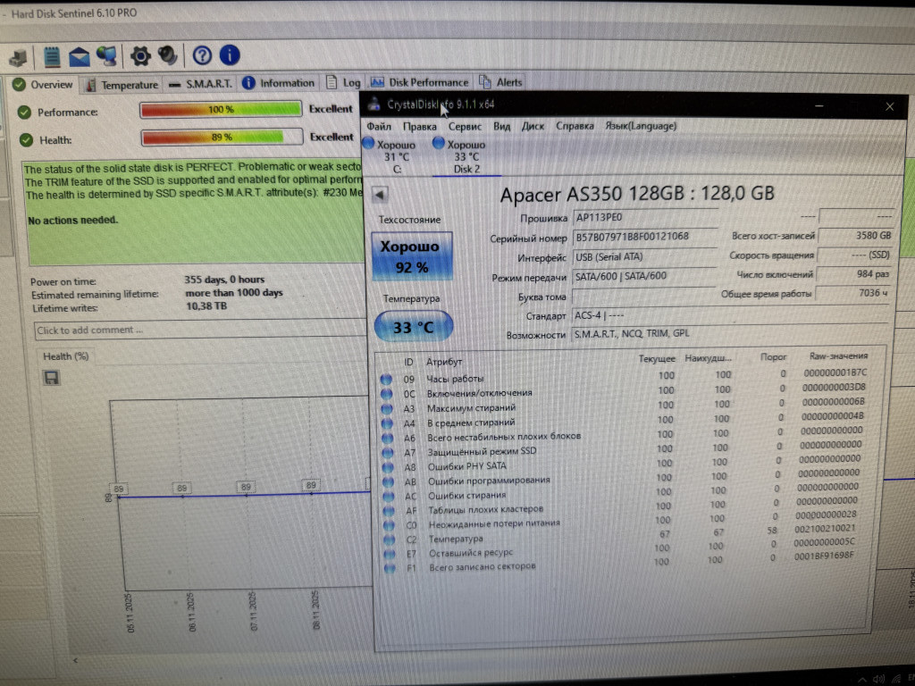 Apacer AS350 128GB Здоровье 92%, наработка 7036 часов