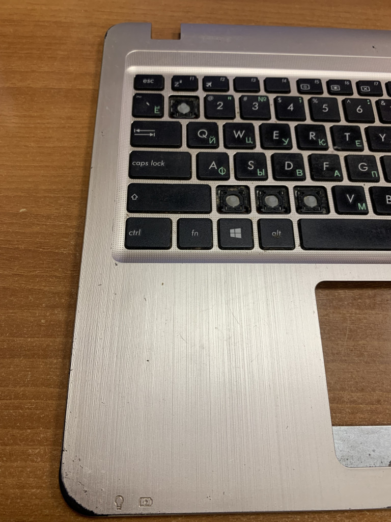 Много потертостей, царапин, не хватает крышек на клавишах, клавиатура работает, ноутбук был залит, сильных следов залития клавиатуры нет 13NB0B01AP03301 13NB0B01P07014