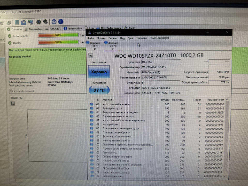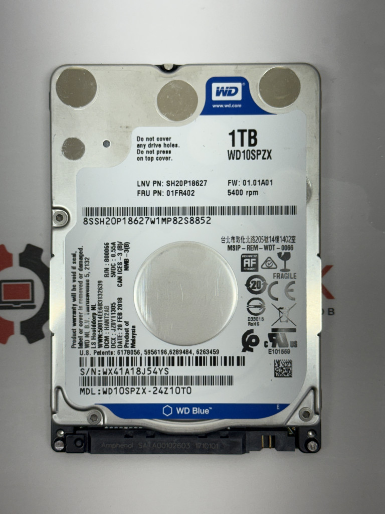 Жесткий диск 2.5 WD Blue 1000GB S/N:WX41A18J54YS Количество включения:2699 Наработка часов:5781 Скорость: 5400RPM