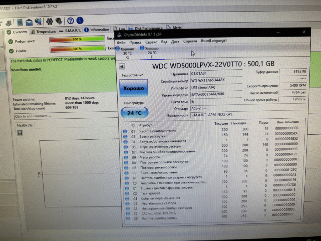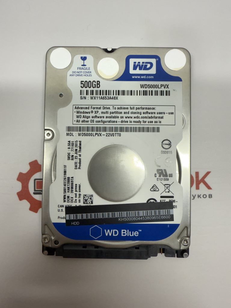 Жесткий диск 2.5 WD Blue 500GB S/N:WX11A653A48X Количество включения:4764 Наработка часов:19502 Скорость: 5400RPM Буфер: 8192kb